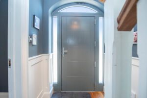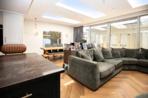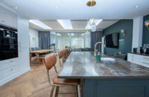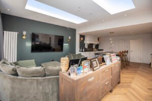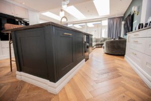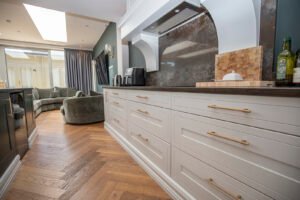 Centre rose, light fitting, recessed lighting, spotlights, high quality——– kitchen, tiled splash back area, stainless steel sink, area fully plumbed, integrated fridge freezer, integrated dishwasher, oven, hob extractor fan, island unit, sliding patio door leading to garden area, quarts countertop, herringbone solid wooden flooring.