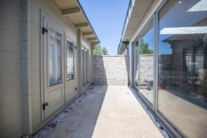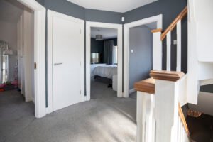 Recessed lights, hot press with immersion and shelving, carpet, flooring.