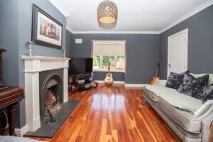 Coving, light fitting, feature fireplace with a wrought iron insert and polished hearth, features a bay window, blinds, wooden flooring.