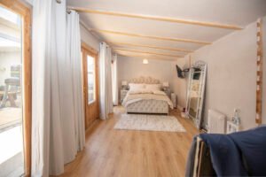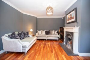 Centre rose, light fitting, recessed lighting, spotlights, high quality——– kitchen, tiled splash back area, stainless steel sink, area fully plumbed, integrated fridge freezer, integrated dishwasher, oven, hob extractor fan, island unit, sliding patio door leading to garden area, quarts countertop, herringbone solid wooden flooring.
