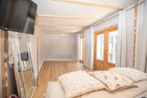 Recessed lights, hot press with immersion and shelving, carpet, flooring.