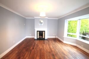 Coving, centre rose, light fitting, blinds, wooden flooring.