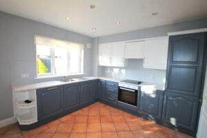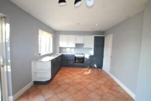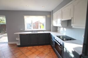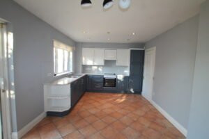 Recessed lighting, spotlights, high quality——– kitchen, tiled splash back area, stainless steel sink, area fully plumbed, freezer, integrated dishwasher, oven, hob, extractor fan, sliding patio door leading to garden area, ceramic tile flooring.