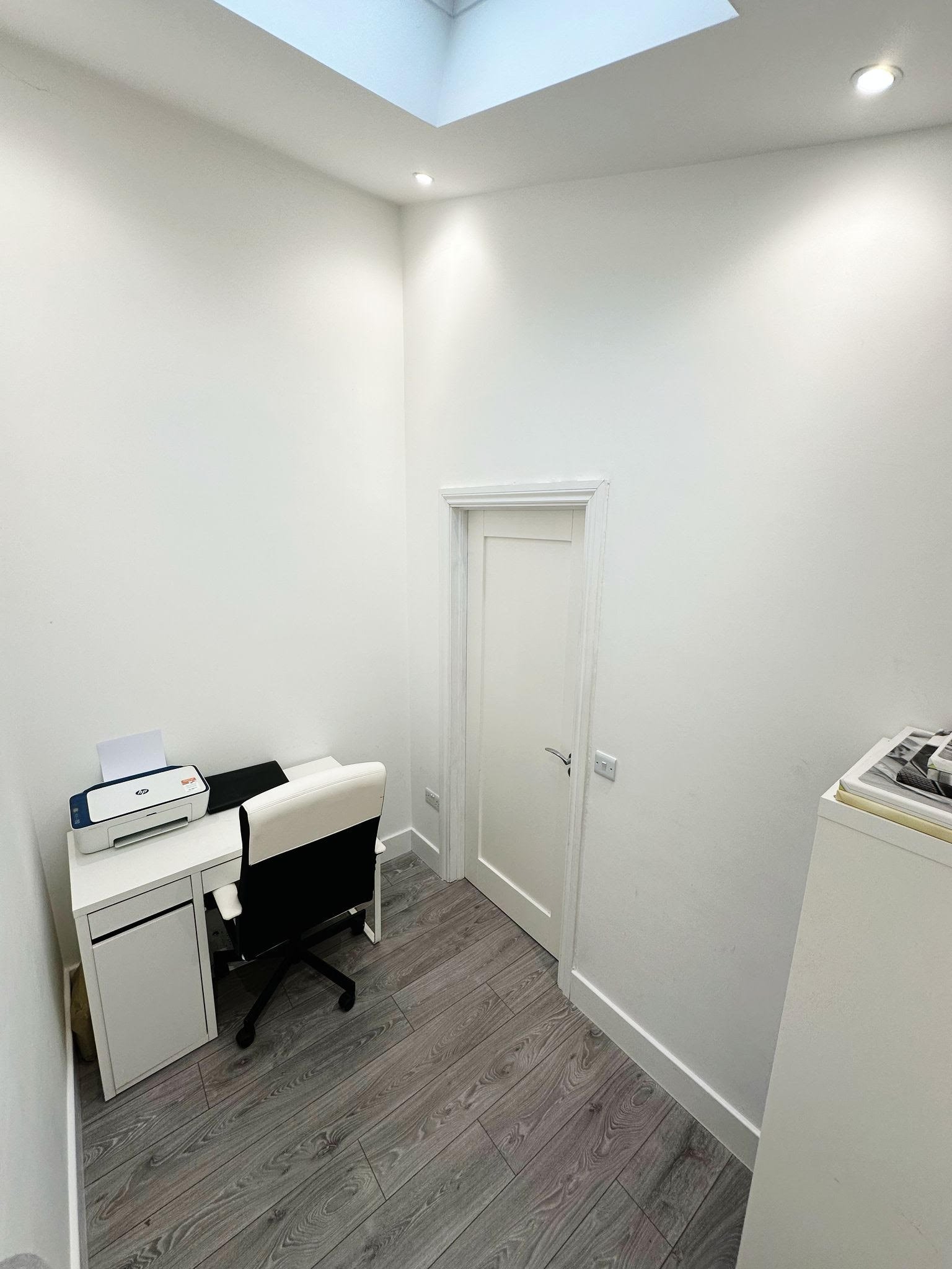 Recessed lighting, wooden flooring, Velux window