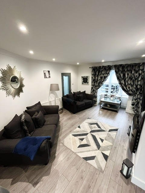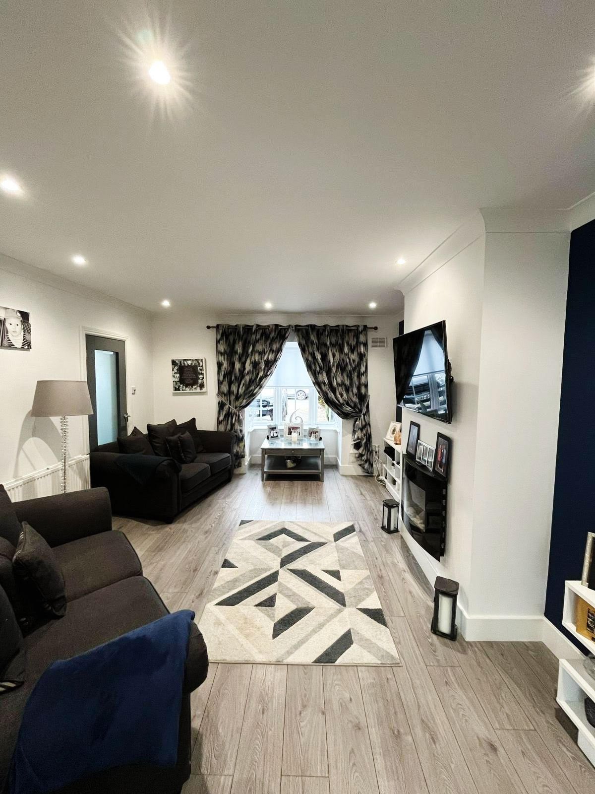 Coving, Recessed lighting, feature fireplace features a bay window, curtains, blinds, wooden flooring.
